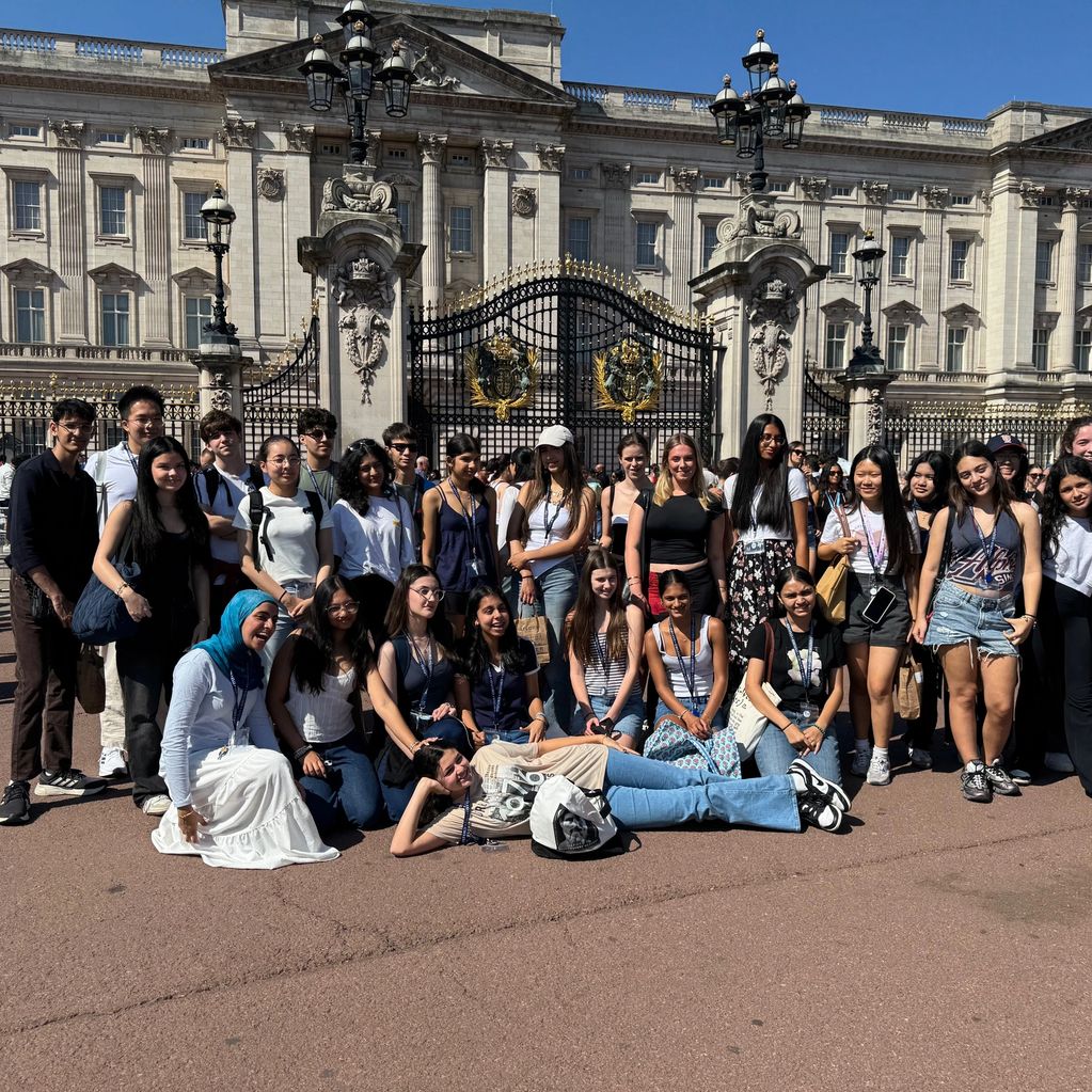The 2025 cohorts of Team Pythagoras and Team Herodotus had a blast on their study trip to London! Photo taken in front of Buckingham Palace.